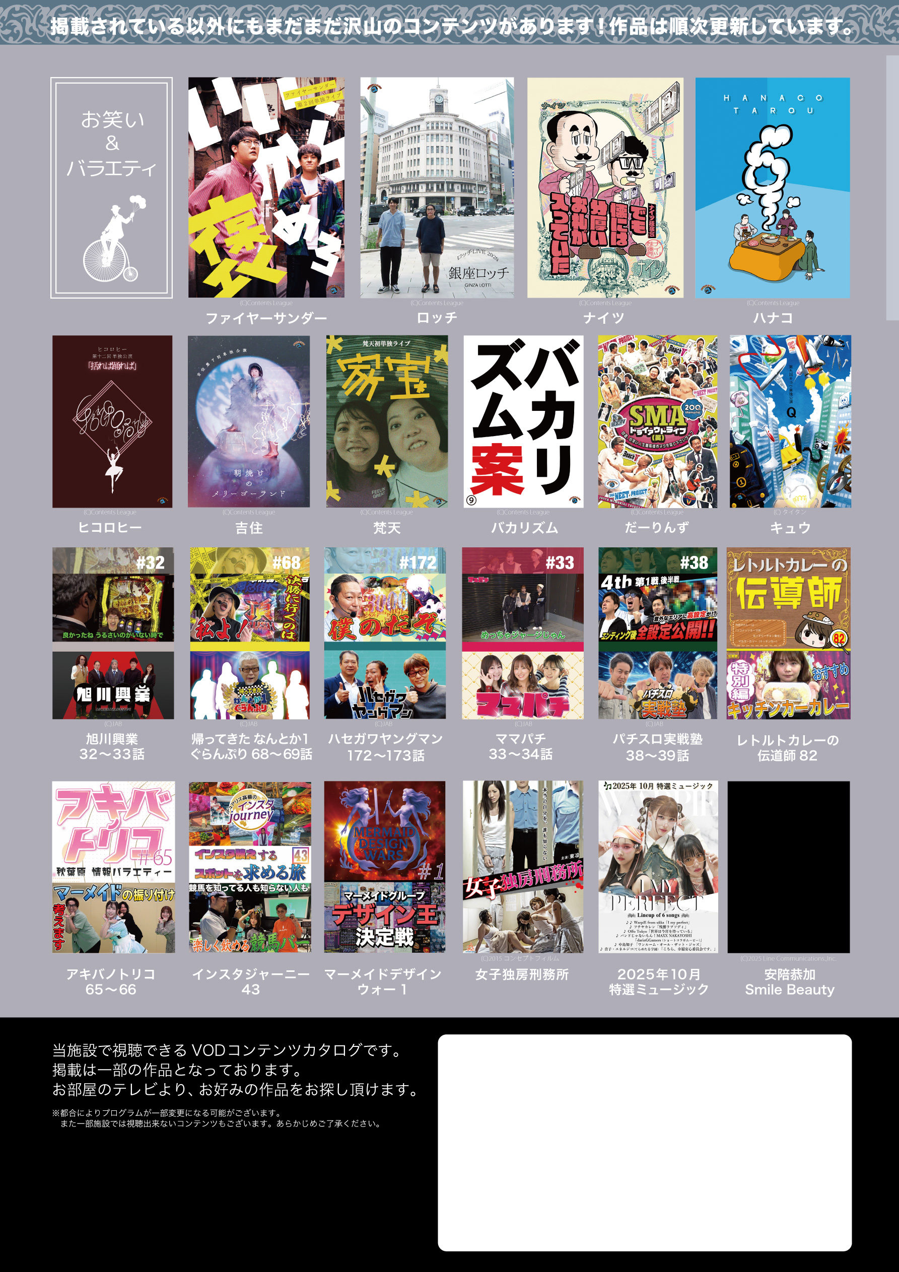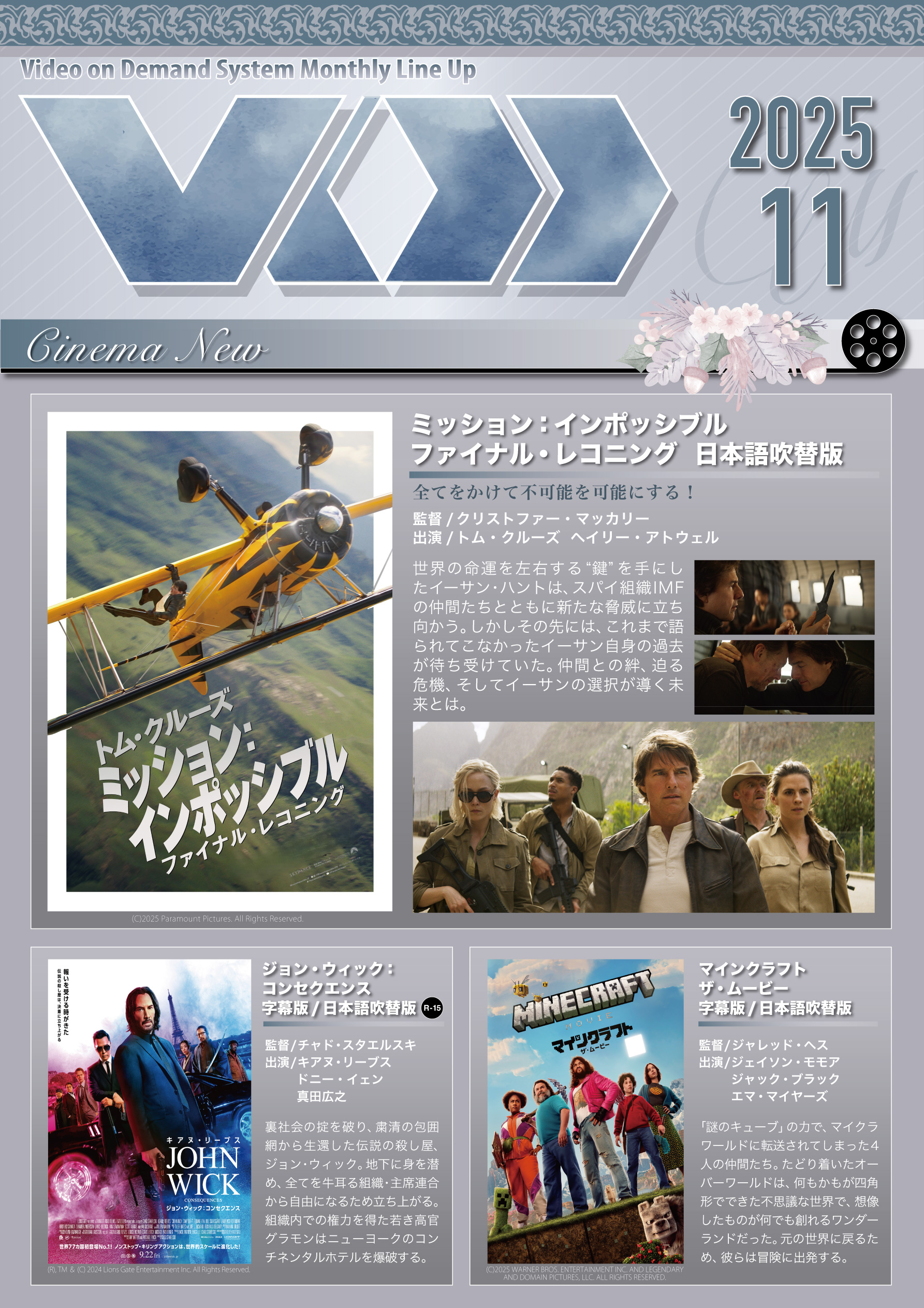 株式会社パレットからのお知らせ [2025年11月号] 客室テレビで見放題! 新着映画投稿日: 投稿日: 2025年11月1日更新日: 2025年10月15日 今月の注目作品 今月のピックアップ 配信内容は予告なく変わる場合がございます カタログ掲載期限:月末まで 記事一覧